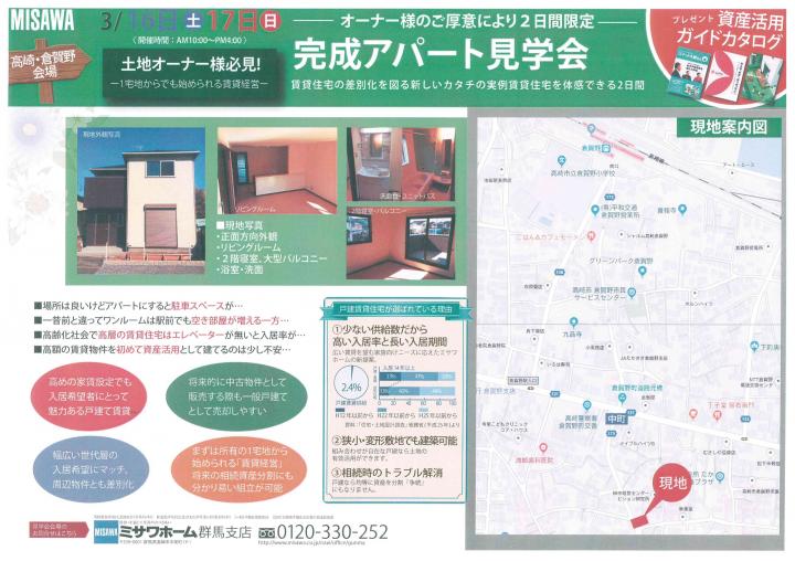 見学会の日程は3月16日(土)・17日(日)の10:00~16:00になります。