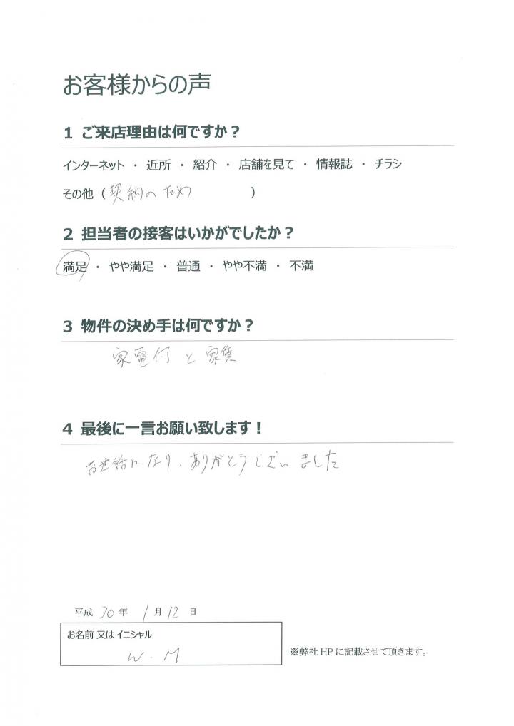 家電付きの物件に対する家賃を抑えた物件に加え、ソアードスタッフの対応に満足頂けて、誠に嬉しく思います。
