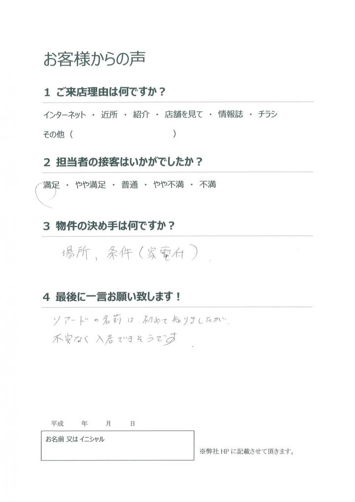 早期での物件のお探しでしたが、家具家電付き、立地を気に入って頂き喜んで頂き私も喜ばしい限りです。
