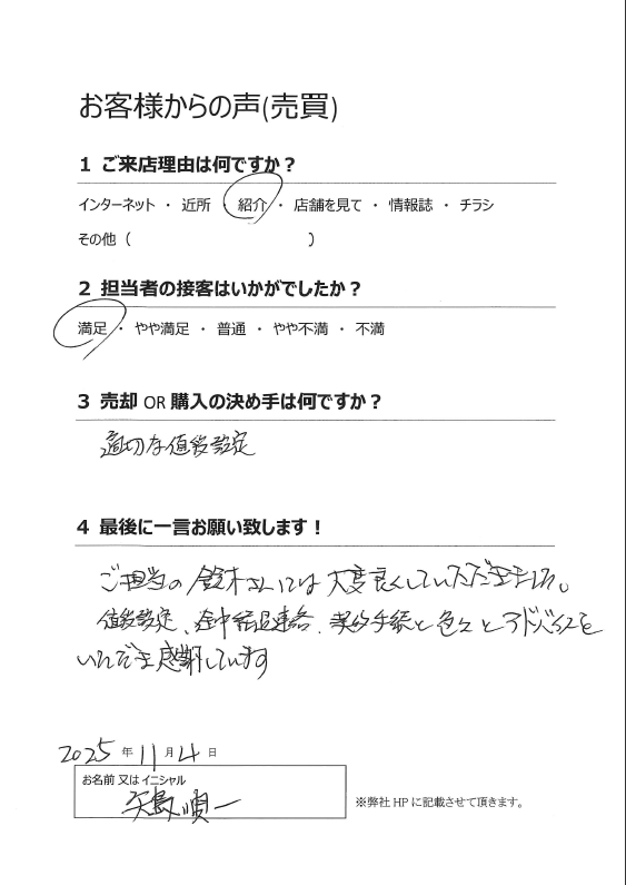 ご売却にあたり、ご満足いただけたこと大変嬉しく思います。